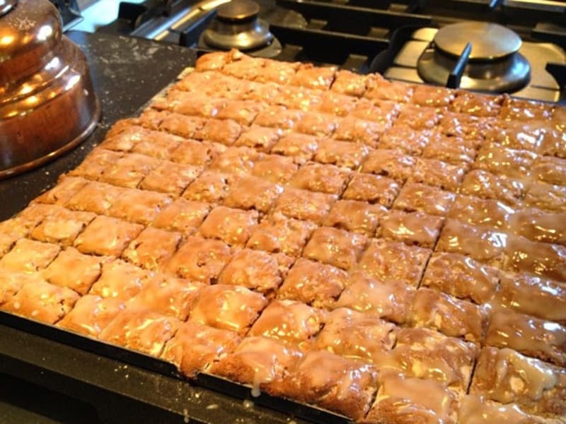 Chauffer le miel et le sucre à feu moyen en remuant. Enfourner à 170C et cuire 15 min. Préparer le glaçage en mélangeant le sucre glace la liqueur et leau.